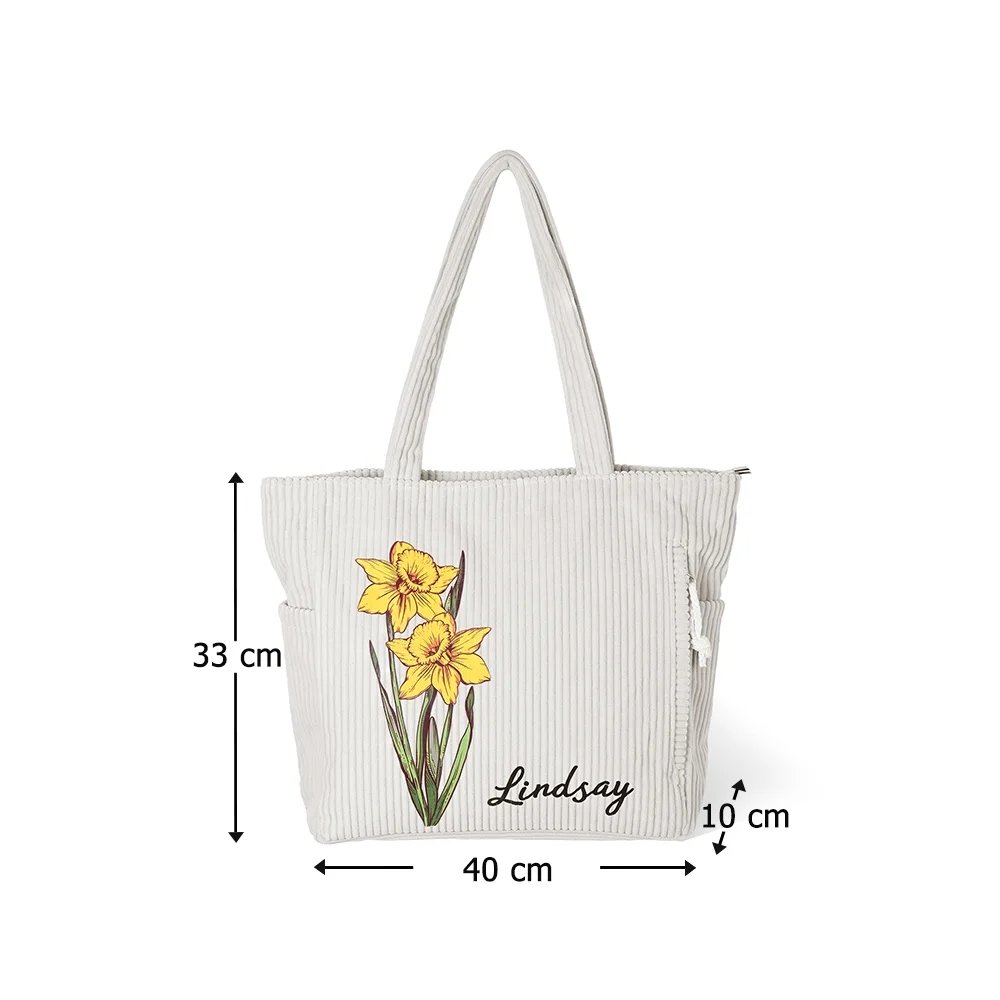 Dit ontwerp draait om een unieke geboortebloem en kan worden gepersonaliseerd met een naam. De zachte en elegante uitstraling geeft de tas een persoonlijke betekenis en sluit mooi aan bij een vrouwelijke stijl. De ribfluwelen stof zorgt voor een warme, vintage uitstraling en maakt van deze alledaagse tas een bijzonder accessoire met zowel emotionele waarde als een verfijnde uitstraling.