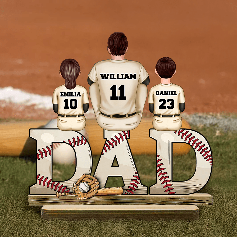 Deze houten plaquette heeft een 'DAD'-titel versierd met een ontwerp in honkbaltextuur, compleet met handschoenen en knuppels die de essentie van honkbal perfect weergeven. Het kan gepersonaliseerd worden met maximaal 5 stripfiguren in honkbaluniformen en elk personage heeft een aangepaste naam en nummer. Het ontwerp laat perfect je liefde voor het spel zien.