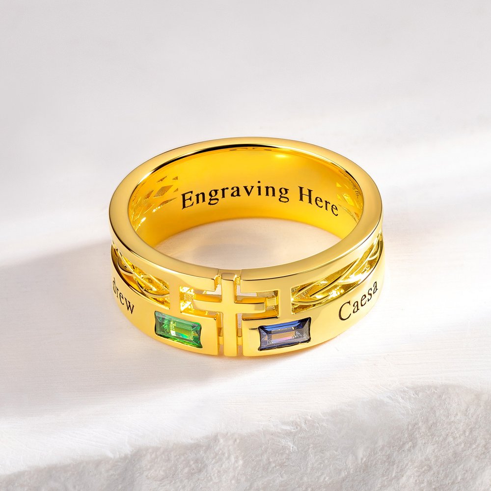 Het kruis belichaamt geloof en bescherming, terwijl de geboortesteen iemands unieke levensreis vertegenwoordigt, waardoor een diepgaande symboliek ontstaat. Het ontwerp van de ring straalt kracht uit, zonder overbodige versieringen, waardoor hij geschikt is voor alle dagelijkse gelegenheden.