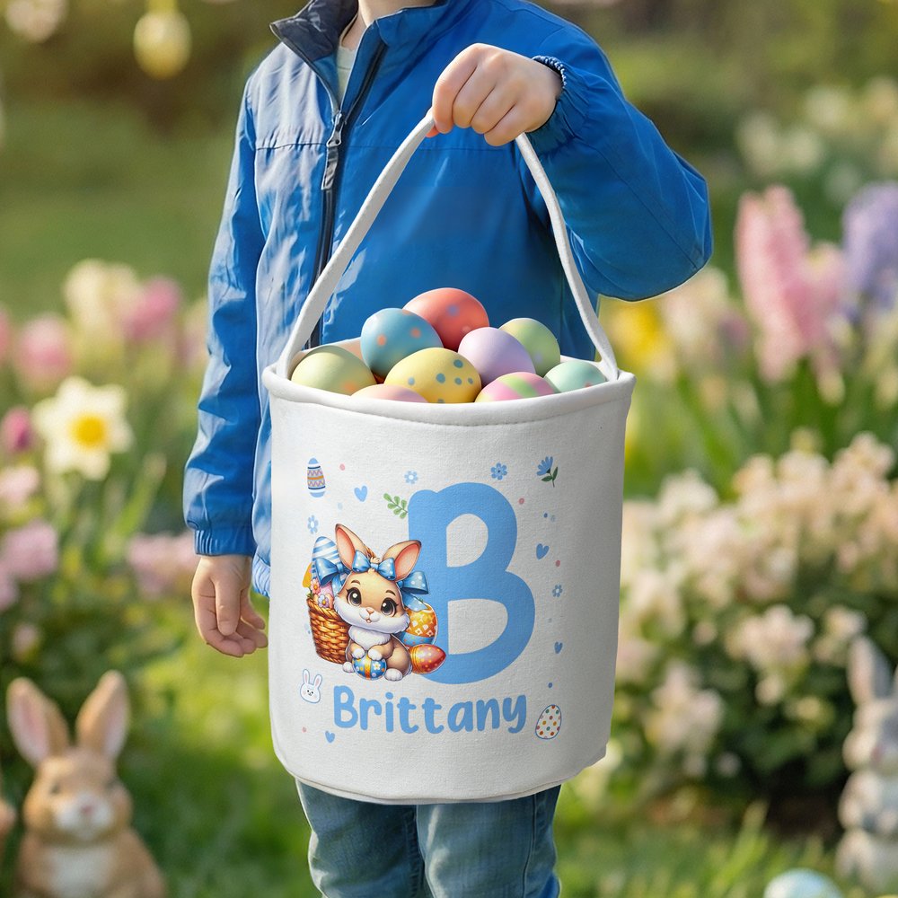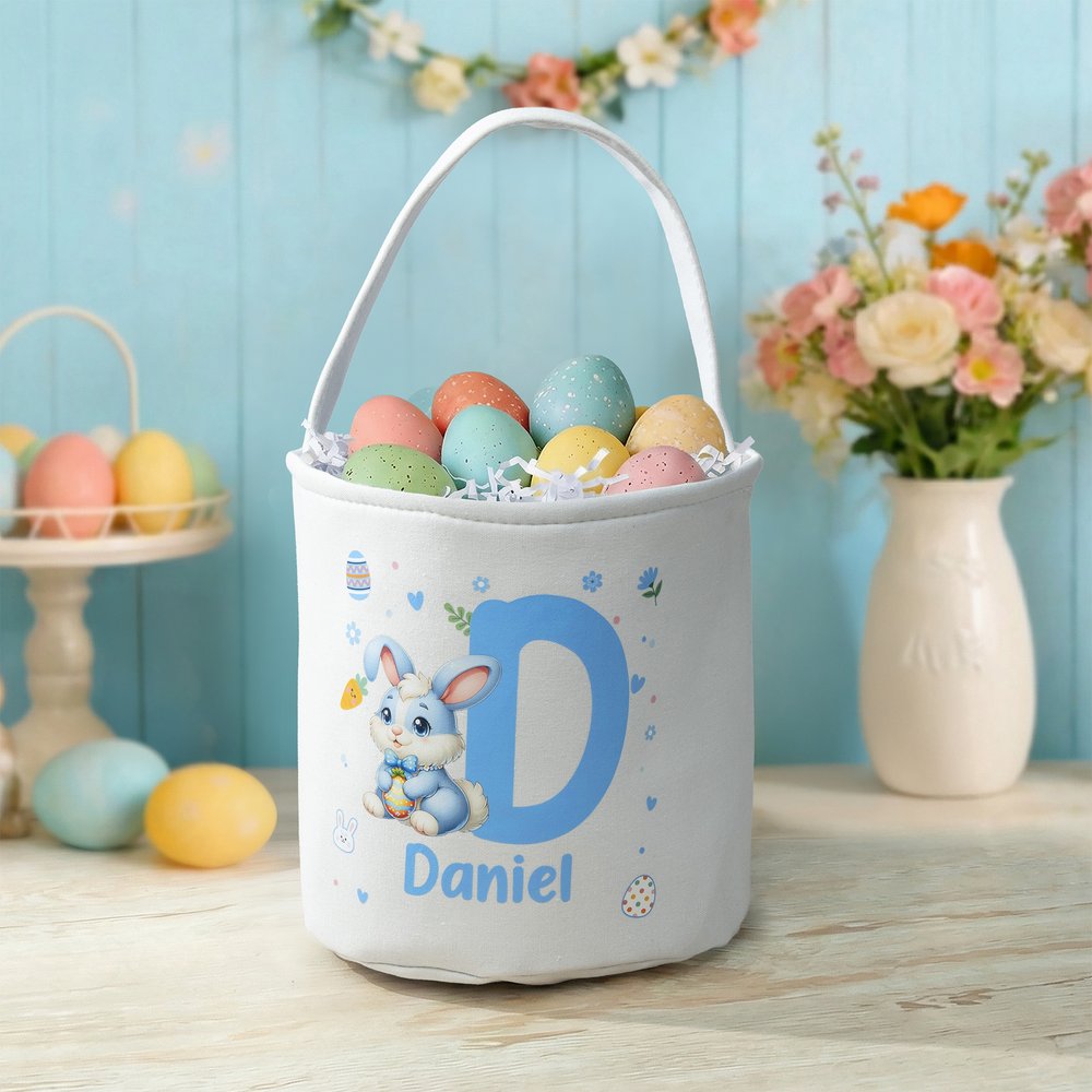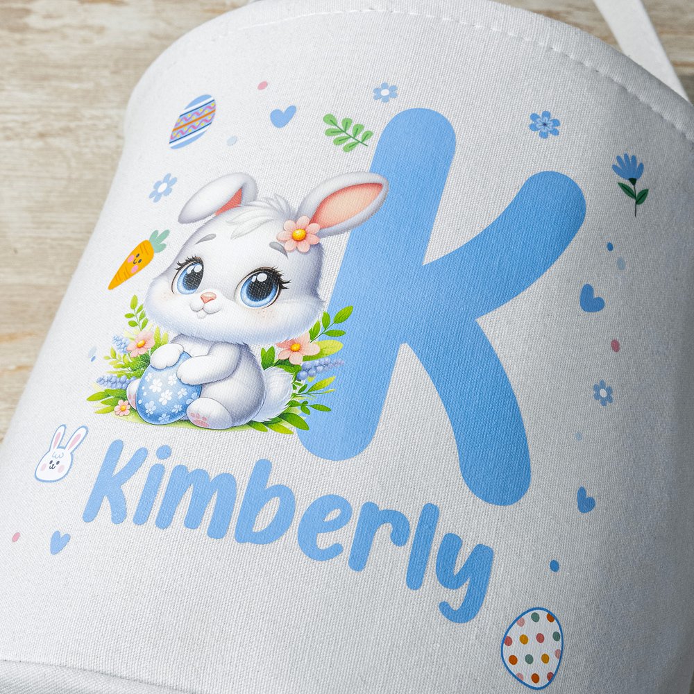 Deze mand is voorzien van een schattig haasje als centraal motief en kan worden gepersonaliseerd met de naam of initialen van een kind, wat zorgt voor een uniek en persoonlijk uiterlijk. Rondom het konijntje staan paasmotieven zoals kleurrijke eieren en bloemen. Deze motieven zorgen voor speels plezier en een feestelijke sfeer. Of het nu tussen een stapel eieren staat of in een hoek van het huis, dit mandje zal zeker de aandacht van kinderen trekken en een vrolijke en mooie aanvulling zijn op het paasgebeuren.