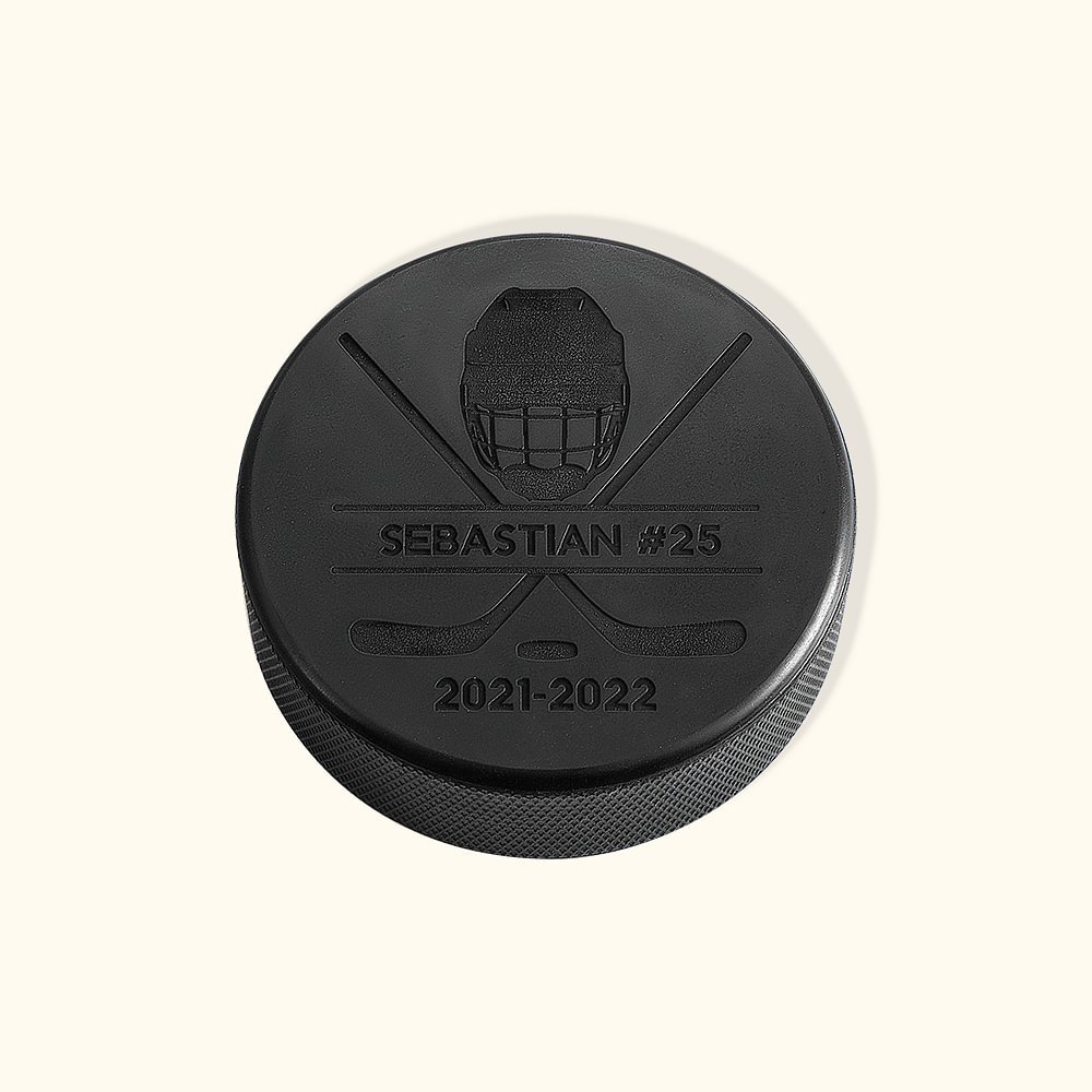 De op maat gegraveerde pucks kunnen je teamlogo, spelersnaam, nummer en jaartal bevatten! Een geweldig eindejaarsgeschenk voor spelers en coaches. De afbeelding wordt aan één kant van de puck gegraveerd.