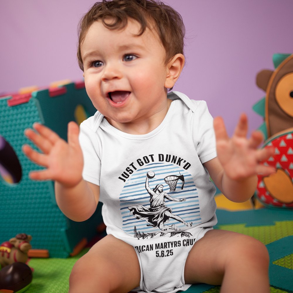 Dit schattige babyrompertje heeft de humoristische zin "Just Got Dunked" en een Jezus-patroon, wat een luchtig tintje geeft aan de speciale doopdag van je kleintje. Het ontwerp kan worden gepersonaliseerd met de naam van de kerk en de doopdatum, waardoor het een dierbaar aandenken wordt voor gezinnen die de spirituele mijlpaal van hun baby vieren.