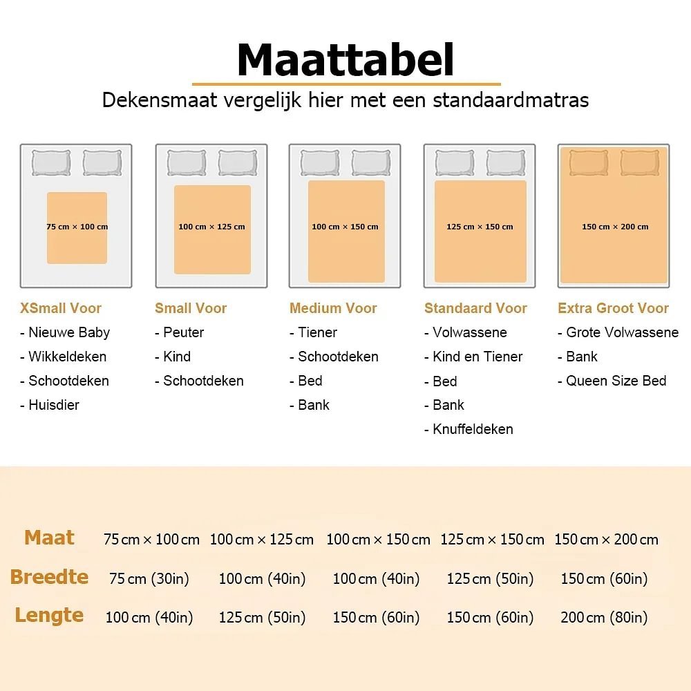 | Afmeting: | Sherpa Deken: 100 cm × 125 cm (40" × 50"), 125 cm × 150 cm (50" × 60"), 150 cm × 200 cm (60" × 80"), Fleecedeken: 75 cm × 100 cm (30" × 40"), 100 cm × 125 cm (40" × 50"), 125 cm × 150 cm (50" × 60"), 150 cm × 200 cm (60" × 80") |