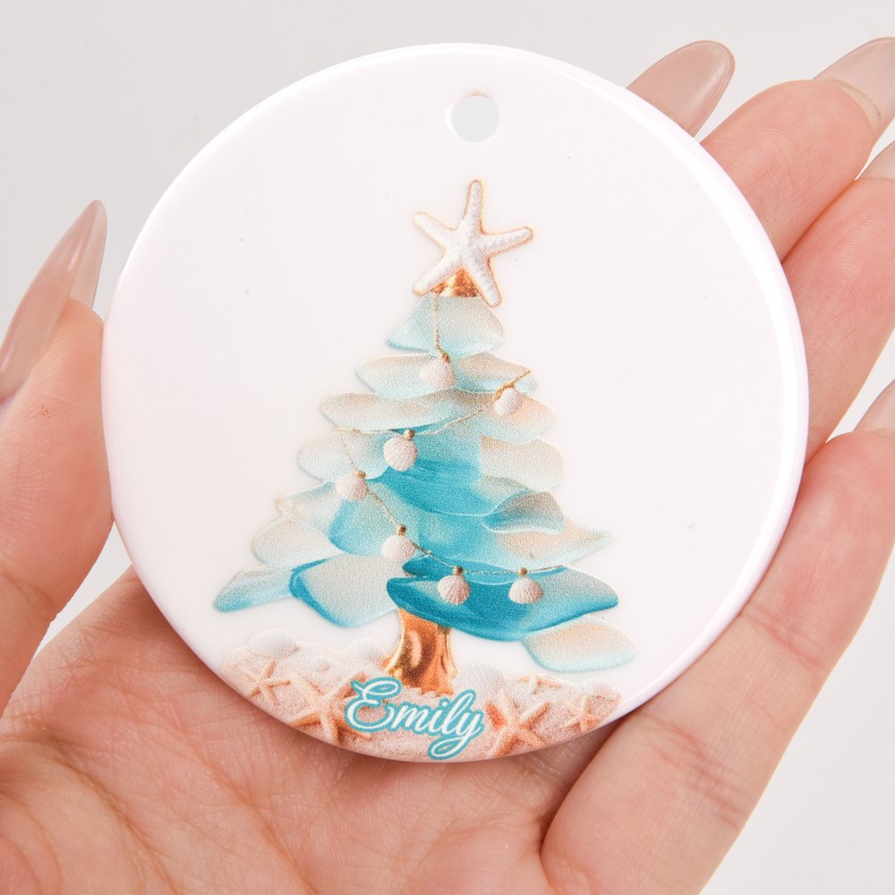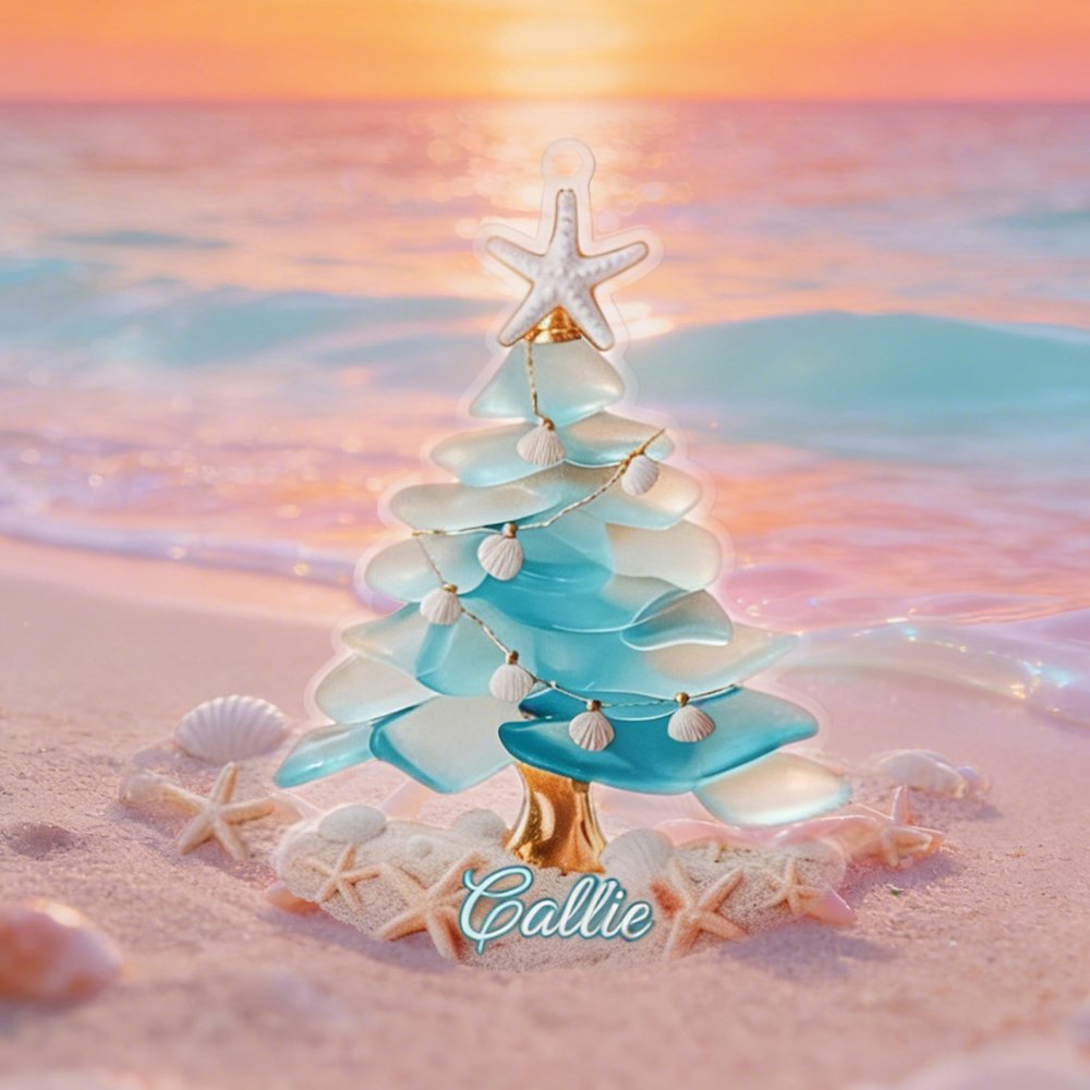 Dit ornament is geïnspireerd op kerstbomen van zeeglas en geeft de essentie van de oceaan weer in rustgevende tinten turquoise en blauw. Een witte zeester bekroont de bovenkant, kleine schelpen kwastjes sieren de takken en de basis is omlijst met zeesterren en zand-achtige texturen-elk detail vertelt een verhaal van getijden en zonlicht. Voeg een eigen naam toe aan de onderkant en maak van dit sieraad een uniek aandenken aan de oceaan.