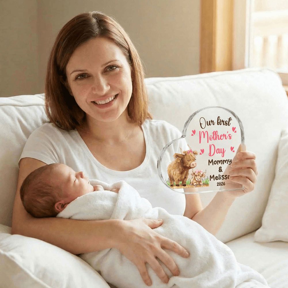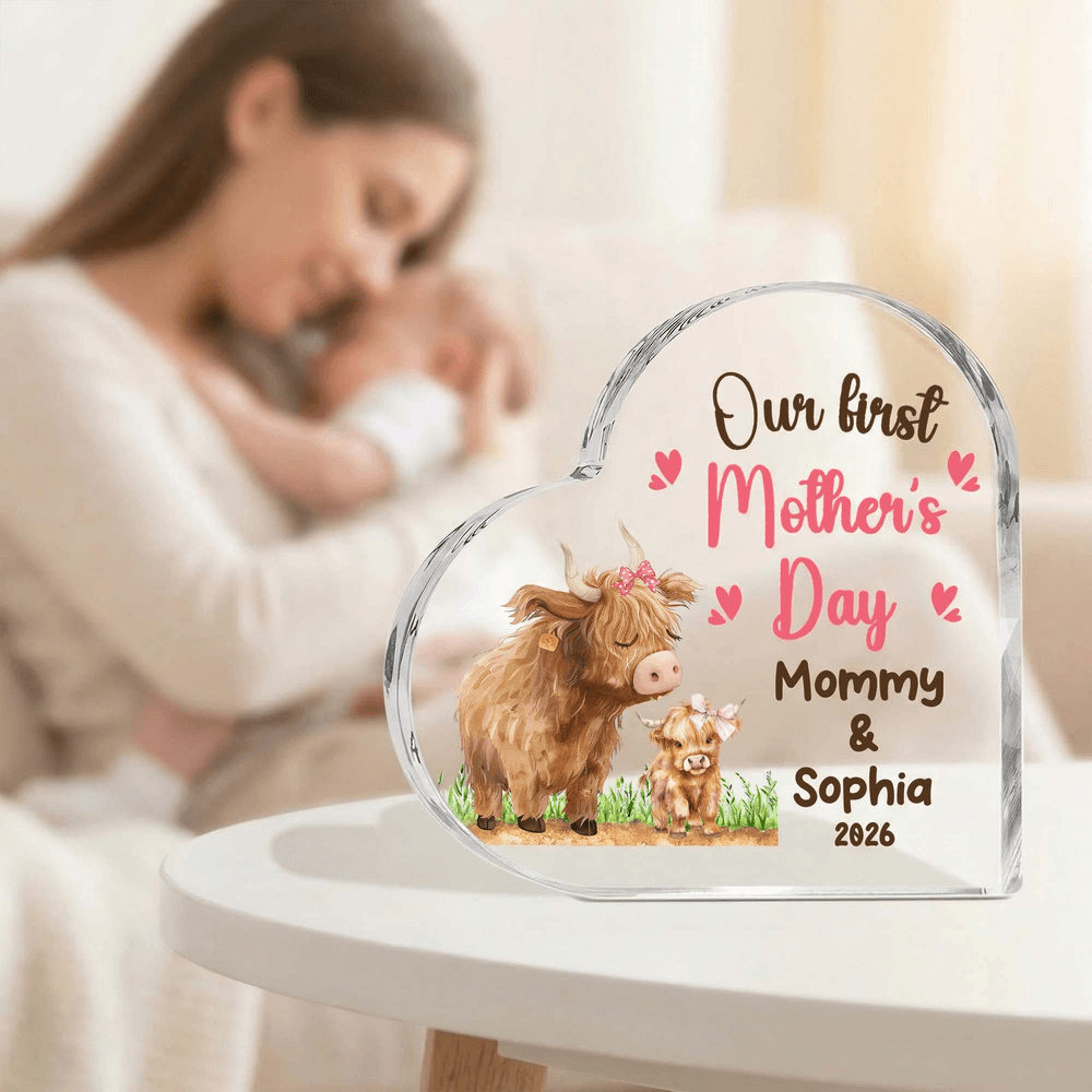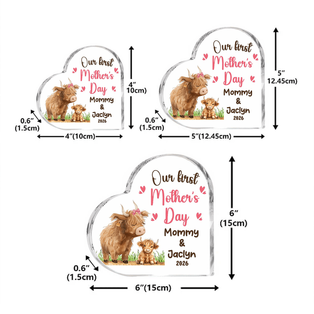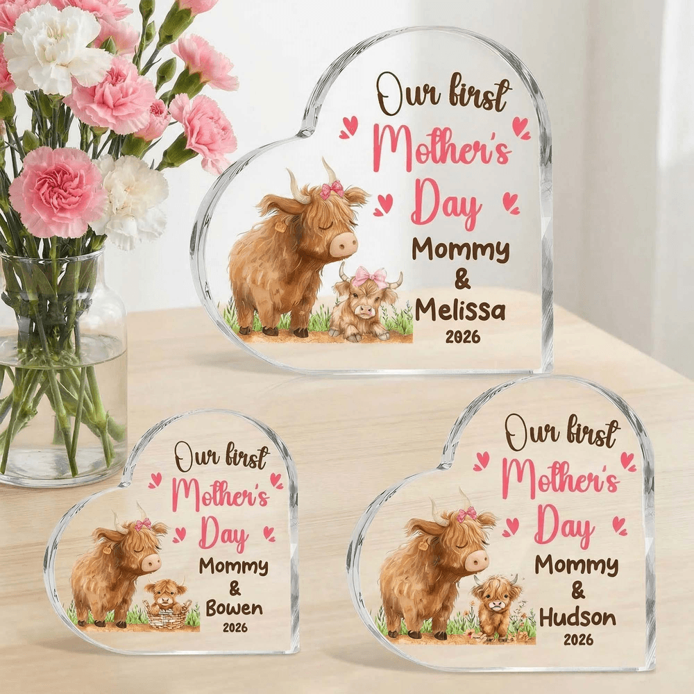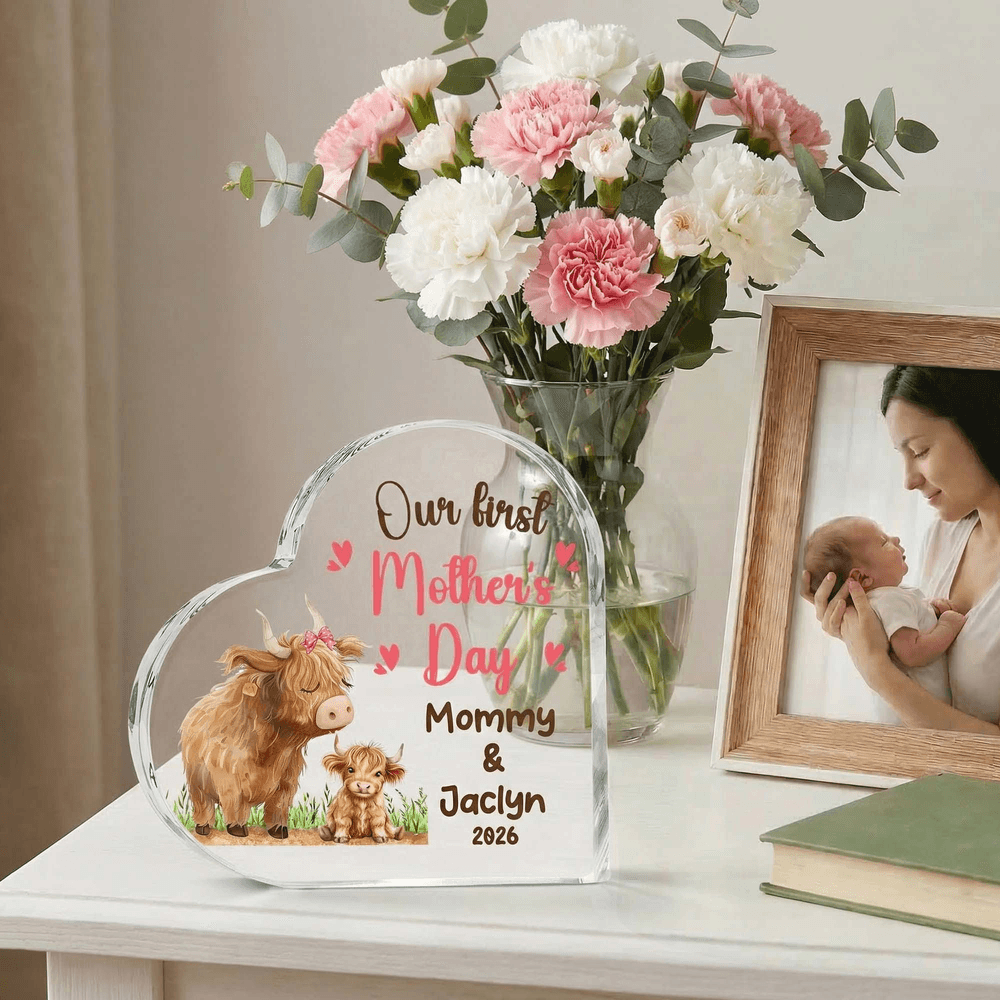 Deze acrylplaat is prachtig ontworpen in de vorm van een hart en versierd met schattige hooglandkoeien en onze eerste Moederdagquote, die de diepe liefde voor mama perfect uitdrukt. Je kunt het aanpassen met de naam van mama en je kind om een betekenisvol aandenken te maken.