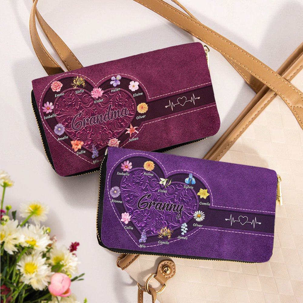 Deze portemonnee heeft een hart aan de linkerkant, een combinatie van een vintage bloemenpatroon met elementen van de geboortebloem. De rechterkant is voorzien van een kloppend hartsymbool, waardoor een elegant en hartverwarmend ontwerp ontstaat. De portemonnee kan worden aangepast met 1-12 namen, afhankelijk van het aantal familieleden, elk gekoppeld aan een uniek geboortebloempatroon, dat de tederheid en trots van een moeder of grootmoeder als het hart van de familie laat zien.