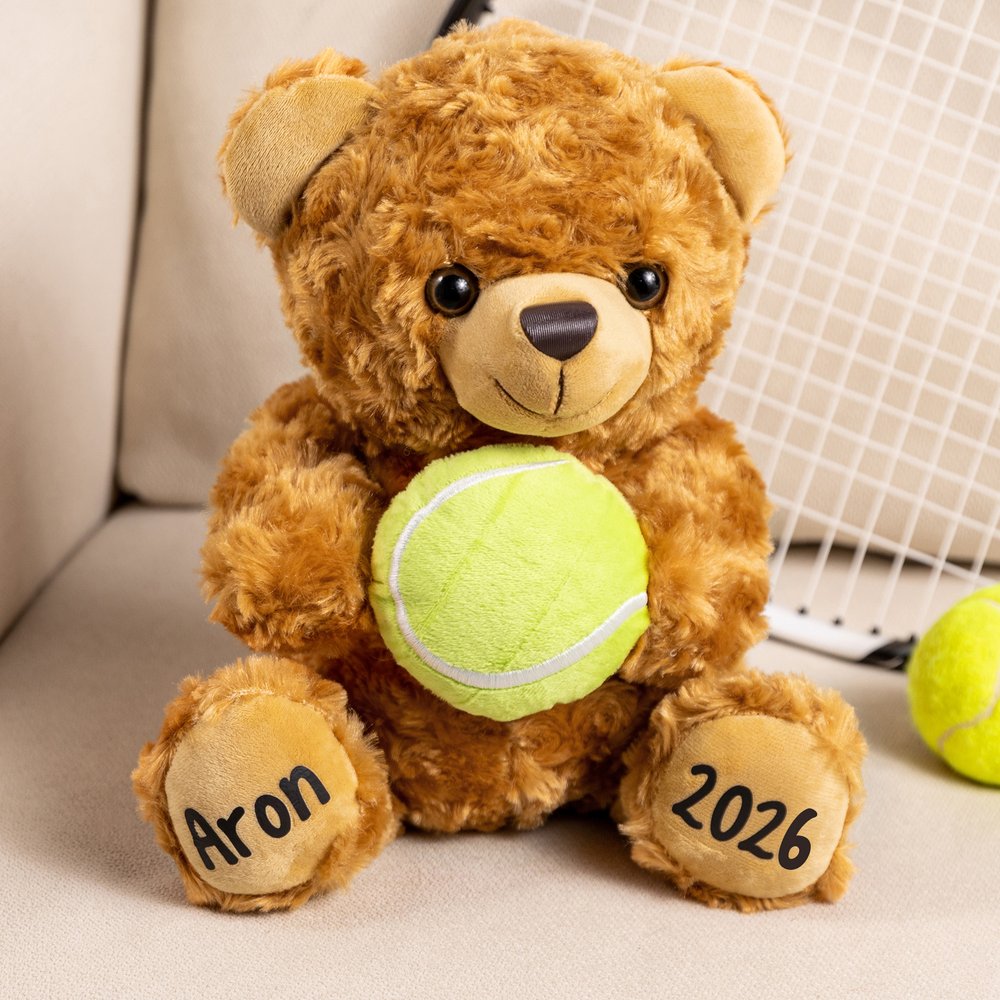 Deze schattige pluchen beer is verkrijgbaar in twee kleuren: bruin en wit. Elke beer heeft een bal in zijn handen en je kunt je favoriet kiezen uit vijf soorten: honkbal, tennis, volleybal, voetbal en basketbal. Bovendien zijn er aanpasbare gebieden op de linker- en rechtervoet van de beer waar je een naam en datum kunt toevoegen om een op maat gemaakte pluchen beer voor jou te maken.
